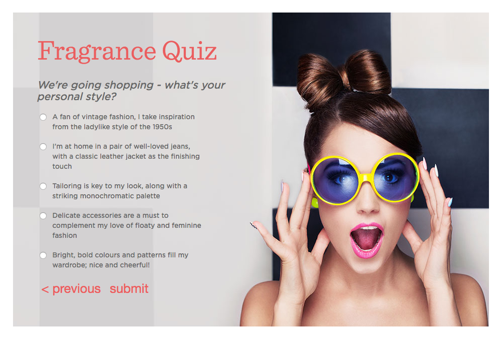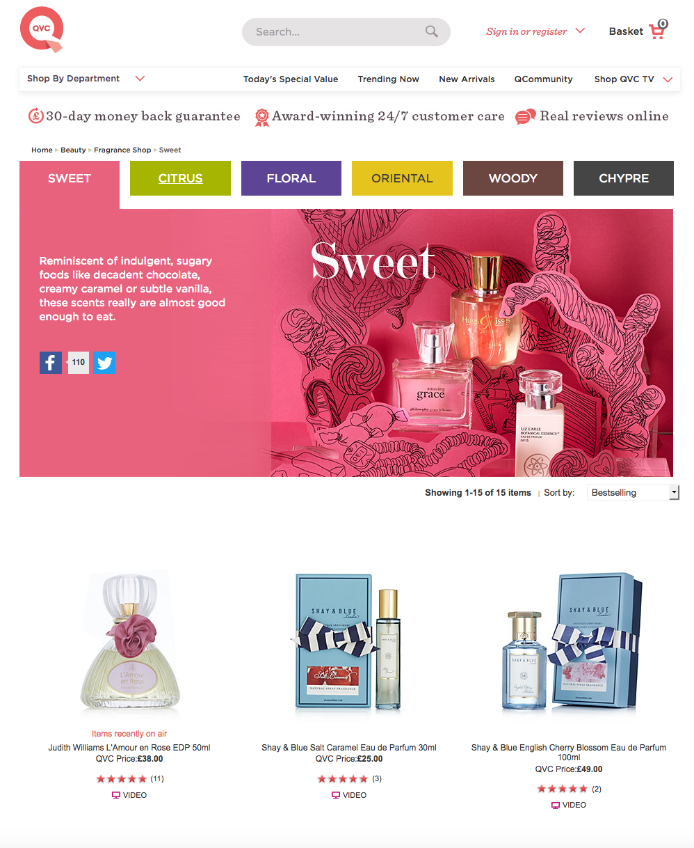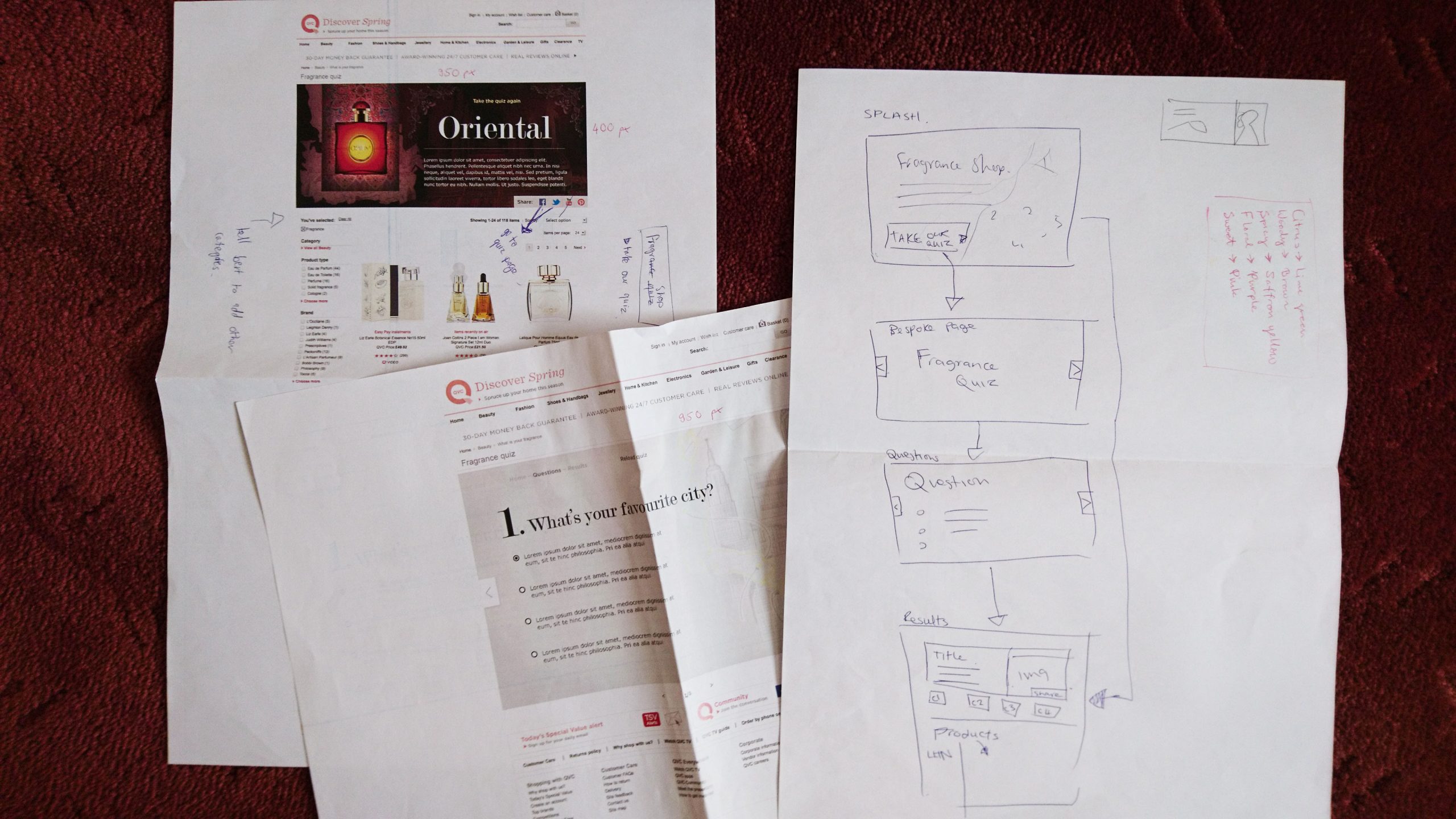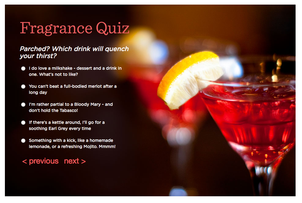 We were asked to come up with a campaign to help drive sales for the fragrance sector within the QVC Beauty department. After several weeks of research and storyboarding I came up with a personality quiz designed to engage customers and guide them toward suitable fragrance products, presented to the beauty buyers and board. They signed off on my fragrance quiz idea so it was time to get to work on a strategy for implementation.
