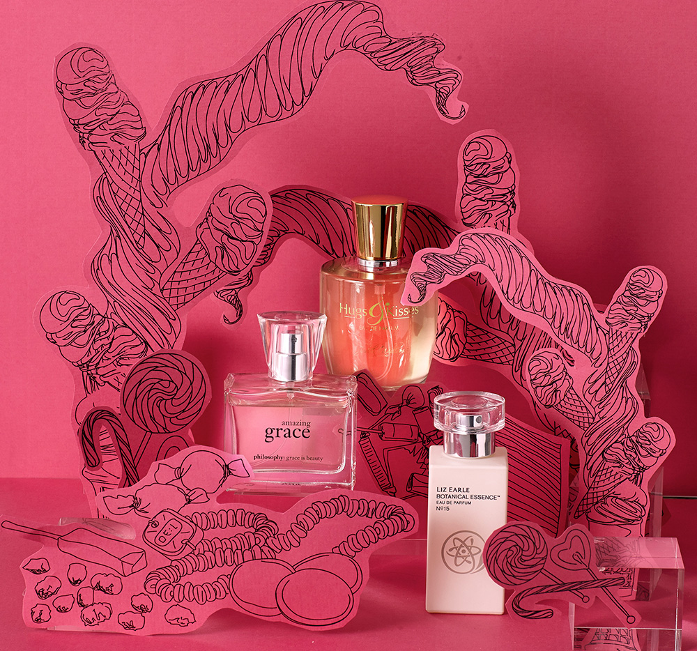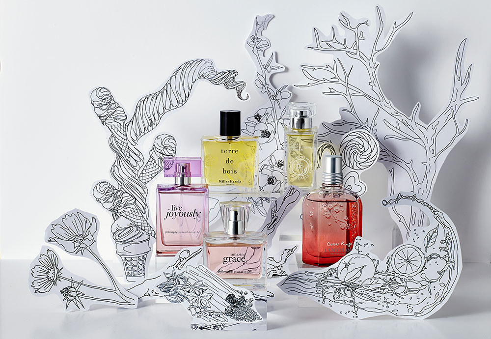 I proposed the photography concept, pitched it to the team, and secured approval before moving forward. Once approved, we organised the fragrances into groups, which informed the colour-ways used in the final images. These images began as illustrations created by another designer in my team, they were then enlarged, cut out on coloured card, and arranged around the fragrance bottles. I thought of a unique way to display the fragrance bottles, which I then art-directed during the photoshoot.. The end result exceeded the initial sketches, demonstrating the power of thoughtful staging and creative collaboration.